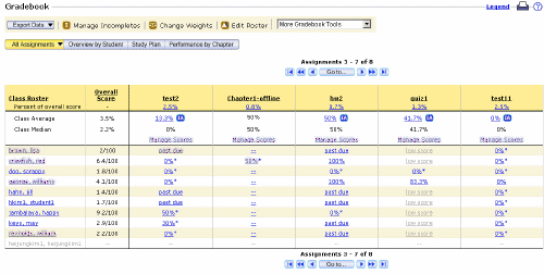 MathXL's online gradebook automatically tracks your students' results on tests, homework, and tutorials and gives you control over managing results and calculating grades. All MathXL grades can be exported to a spreadsheet program, such as Microsoft Excel. The MathXL Gradebook provides a number of views of student data and gives you the flexibility to weight assignments, select which attempts to include when calculating scores, and omit or delete results for individual assignments.